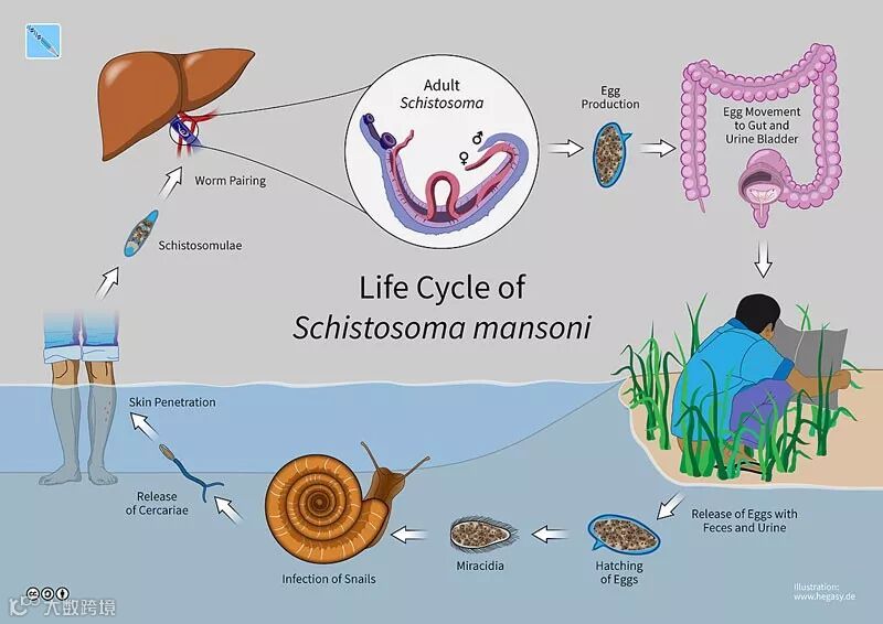 曼氏血吸虫的生命周期。水域和蜗牛是该寄生虫重要的传播媒介。图片来源:Wikipedia
