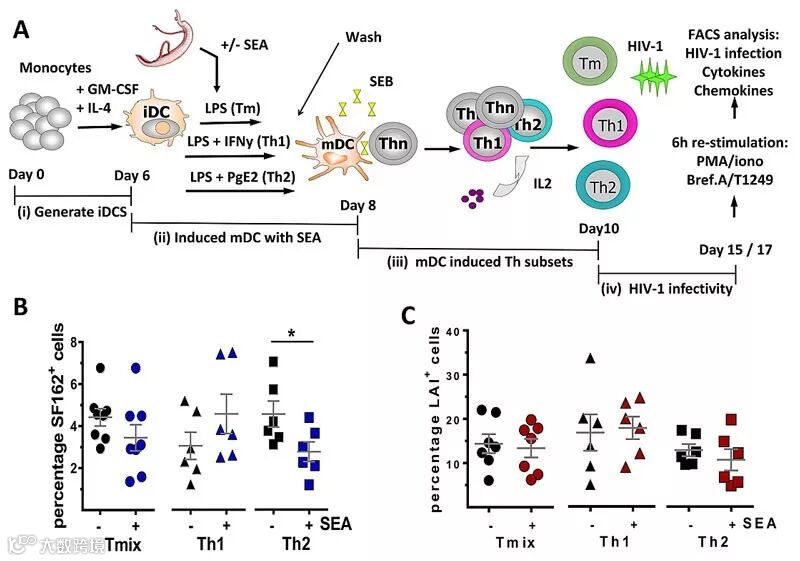 当CD4+ T淋巴细胞识别到不同感染源,会被诱导成不同的效应细胞(Th细胞)。通常来说,Th1细胞由病毒感染诱导,Th2细胞由寄生虫感染诱导,Th17细胞由细菌和真菌感染诱导。那么寄生虫是否会影响CD4+ T淋巴细胞的诱导产物呢?为此,研究人员建立一套体外培养体系。他们将寄生虫与未成熟的DC细胞(iDC细胞)共培养,通过LPS等刺激物使DC成熟,并与CD4+ T淋巴细胞相互作用,产生不同类型的Th细胞。最后将这些Th细胞与HIV-1一起培养,进行感染,以SF162+信号作为细胞感染了HIV-1的证据。结果表明,SEA能够明显降低Th2细胞对HIV-1的易感性,而对Th1细胞基本没有影响。Omega-1作为SEA的主要成分之一,同样能够抑制HIV-1感染,并可能影响疾病进程。