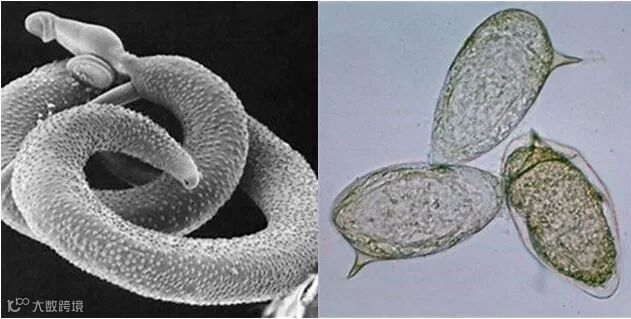 曼氏血吸虫(左)和虫卵(右)的显微照片。图片来源:Wikipedia、MSU