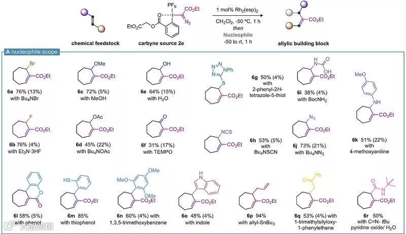 在优化的条件下,研究人员对不同亲核试剂进行了拓展,可喜的是试验的十几种亲核试剂均能很好地捕获烯丙基碳正离子从而构建多种烯丙型分子砌块。比如:1)用Bu4NBr或Et3N•3HF可构建碳-溴或碳-氟键;2)用甲醇、四丁基醋酸铵、水或TEMPO可构建碳-氧键;3)用硫醇可构建碳-硫键;4)用Bu4NSCN、叔丁基氨基甲酸酯、Bu4NN3或4-甲氧基苯胺可构建碳-氮键;5)用富电子的芳烃、杂芳烃、烯丙基三丁基锡、烯醇硅醚或叔丁基异氰化物、吡啶氧化物以及水的混合物则可构建碳-碳键。总的结果就是形成了一个新的C-C单键、一个新的C-C双键和在原烯烃sp2杂化碳上产生新的不对称碳。