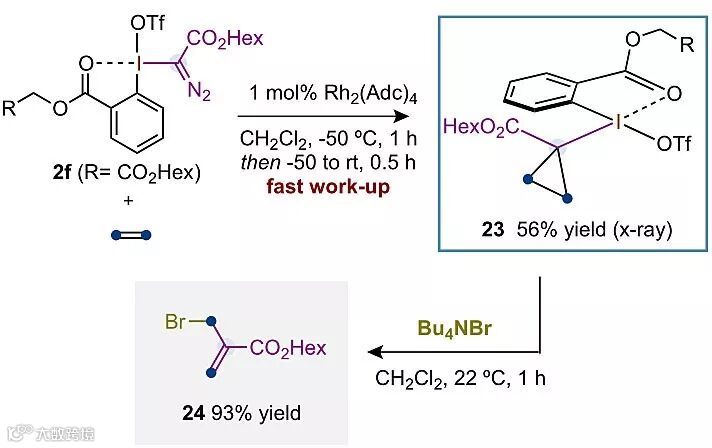 前文已经提到,研究人员设想该转化存在一个三价碘取代的三元环中间体。尽管该中间体被普遍认为是热力学不稳定的,但研究人员还是想努力拿到这一中间体来证明其设想的正确性。起初他们用苯乙烯和环己烯作为底物在−50 ℃反应下并未获得成功,这可能类似于取代的环丙基对甲苯磺酸酯的电环化开环在动力学上要比相应的未取代的环丙基对甲苯磺酸酯更容易进行。有了这个解释,他们用乙烯和2f为底物,Rh2(Adc)4为催化剂在室温下成功分离得到环丙烷衍生物23,这也是首例烷基-三价碘复合物的报道。控制实验表明中间体23在亲核试剂Bu4NBr进攻下毫无悬念地开环生成烯丙基溴24,进一步证明了设想机理的准确性。