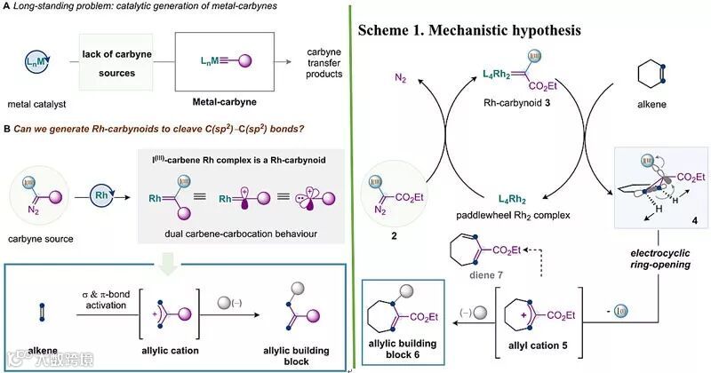 铑-类卡拜的产生及对烯烃插入的设想。图片来源:J. Am. Chem. Soc.