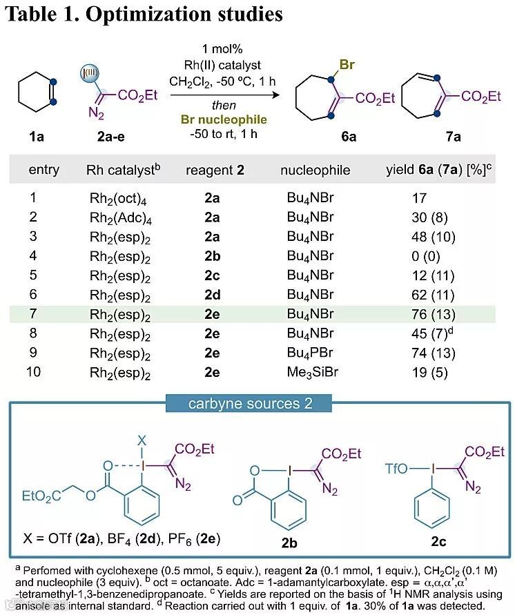 研究人员最初尝试用环己烯1a(5 eq.)、高价碘化合物2a与Rh2(Oct)4在-50 ℃下反应1小时后,向其中加入四丁基溴化铵(3 eq.)再反应1小时,以17%的收率得到烯丙基溴代物6a。若换成更大位阻的催化剂Rh2(Adc)2或Rh2(esp)2(Du Bois catalyst)可显著提高收率(30-48%)。同时还发现高价碘试剂的性质对反应影响很大,比如假环状的2a、2d和2e都能很好的进行转化(以2e为最优),而环状的2b则完全无效。过量的烯烃似乎对转化有利,因为他们用等摩尔量的环己烯和2e反应时产率明显下降(entry 8),可能是过量的烯烃阻止了中间体3的副反应发生。另外,替换成其他溴源如Bu4PBr或TMSBr则对反应无益。