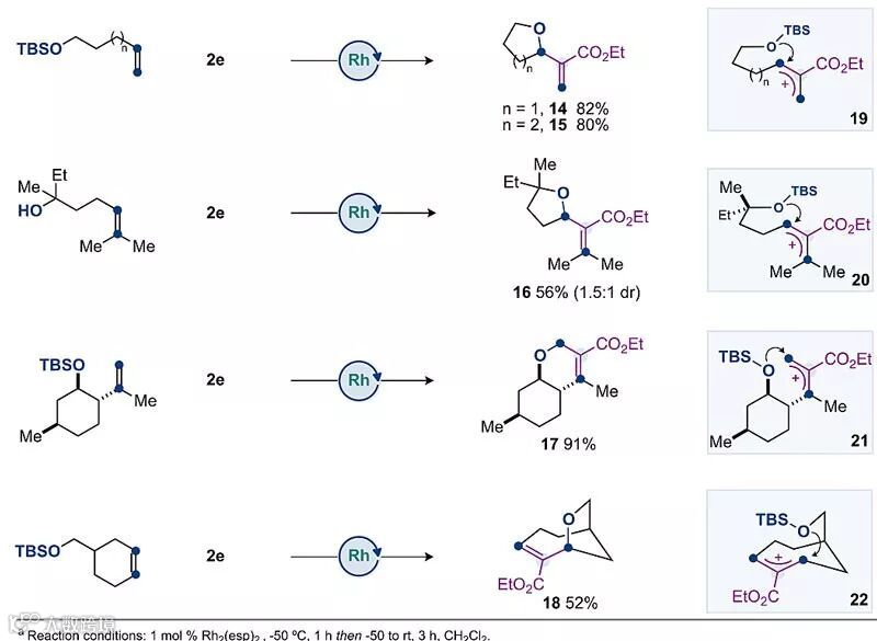 烯丙基阳离子除了能被外源性的亲核试剂进攻外,还能被分子内的亲核基团(如醇)进攻发生串联反应得到环化产物,对于新生成环一般符合Baldwin环化反应规则,即14、15、16和18通过exo-型环化得到,17则通过endo-型环化得到。