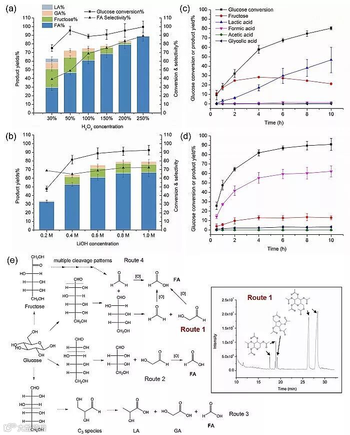 氧化剂、碱、时间对于葡萄糖转化制备甲酸的影响以及反应机理和路径。图片来源:Green Chem.