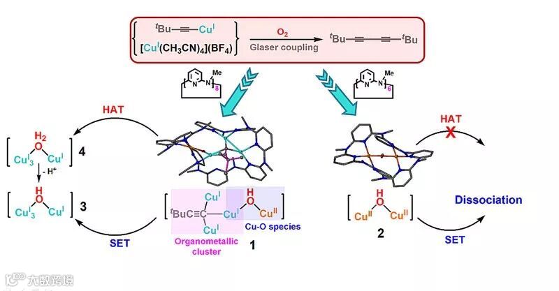铜具有丰富的氧化还原性质,其常见氧化态包括Cu0、CuI、CuII和CuIII。因此,铜不仅常见于许多金属酶的催化中心,同时也在有机反应催化中扮演了极其重要的角色。特别是基于Cu/O2的催化体系,其不仅可以在多铜氧化酶(MCOs)和甲烷单氧酶(pMMO)中进行小分子活化,同时也作为以氧气为氧化剂的绿色催化体系被广泛应用于许多有机反应催化。然而,以往的机理研究主要关注铜-氧活性中心(Cu-O物种)以及有机铜化合物(organocopper)的结构与反应性质,但铜-氧-有机三元复合物作为反应过程中重要的中间体却很少被分离获得。Glaser偶联反应是典型的一类Cu/O2催化反应体系,也是人们认识最早的碳碳键偶联反应之一,已经有150年的历史。但截至目前,其反应机理仍然不太清楚。特别是铜氧物种的作用,其究竟是只起到改变铜氧化态的作用,还是可以与有机底物结合促进偶联反应的发生,仍然不太明确。