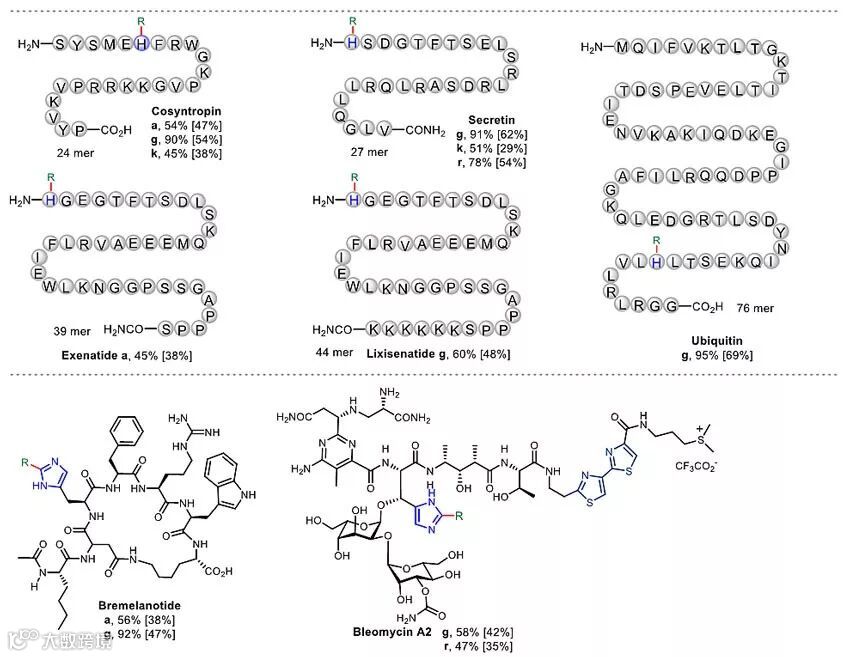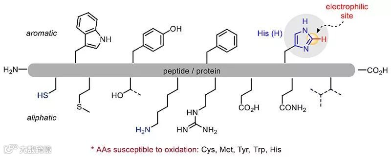 侧链为咪唑环的组氨酸(His),在一些蛋白质(如亚铁血红素、水解酶)功能,包括与金属离子配位、氢键给体/受体、质子穿梭和亲核催化等方面都具有不可替代的作用。由于组氨酸对多肽功能重要性以及低丰度(约2.2%)的特点,使其成为多肽氨基酸残基选择性修饰的一类重要位点。然而,同半胱氨酸和赖氨酸相比,组氨酸亲核性更弱,而且也缺少其它独特的性质,使得对蛋白质或多肽序列中组氨酸位点进行选择性修饰变得异常困难,也是蛋白质和多肽选择性修饰中一个艰巨的挑战。