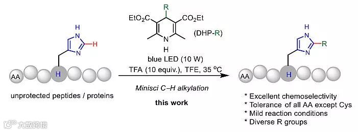上海交通大学王平、南开大学陈弓课题组基于经典的Minisci反应,首次实现了多肽或蛋白序列中组氨酸残基咪唑环C2位的选择性修饰,该方法选择性高,条件温和。机理研究发现DHP在光反应条件下同时作为自由基前体以及氧化剂存在。该反应是多肽组氨酸修饰的重要突破,有望在多肽药物、生物标记等领域发挥重要作用。