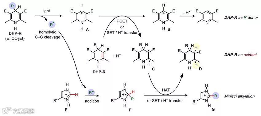 最后,作者对反应机理作出如下推断。在可见光照射下,底物DHP-R吸收光子后被激发,进而发生C-C键的均裂,生成烷基自由基R•和DHP自由基中间体A。A可通过与DHP-R的另一分子进行单电子转移(SET)或质子耦合电子转移(PCET)的方式被氧化,形成阳离子B和自由基C。B失去氢后得到芳构化吡啶产物。亲核性的烷基自由基R•与酸活化的His底物E反应得到自由基阳离子中间体F。后者经过氢转移(HAT)或单电子转移/质子转移(SET/H+)被氧化,得到最终的烷基化产物G和四氢吡啶D。基于上述推断,作者认为DHP-R在对 His的C-H烷基化反应中同时充当R•供体和氧化剂(作为电子或氢原子的受体)。