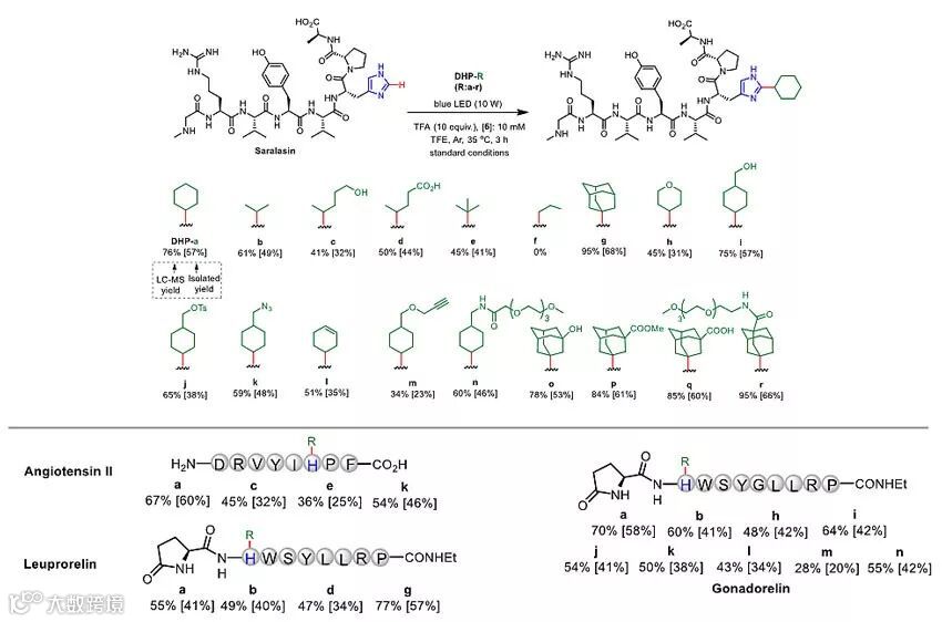 王平、陈弓团队发现Hantzsch ester(1,4-二氢吡啶衍生物,DHP-R)作为烷基自由基前体,在可见光、35 ºC条件下,可以直接对复杂多肽序列中组氨酸咪唑环的C2位进行高选择性C-H官能团化修饰。该方法对不同的DHP(a-r)自由基前体都有很好的兼容性,同时实现了沙拉新、血管紧张素II、亮丙瑞林、戈那瑞林、替可克肽、肠促胰液素、艾塞那肽、利西拉来、泛素、布美诺泰以及博来霉素等数十个复杂多肽药物的后期修饰,体现了极高的应用价值。目前尚无其他方法可以实现对这些复杂多肽的定点修饰。同时,金刚烷自由基前体与这些多肽反应能够以定量的收率得到产物,实现了对多肽组氨酸的高效修饰和标记。