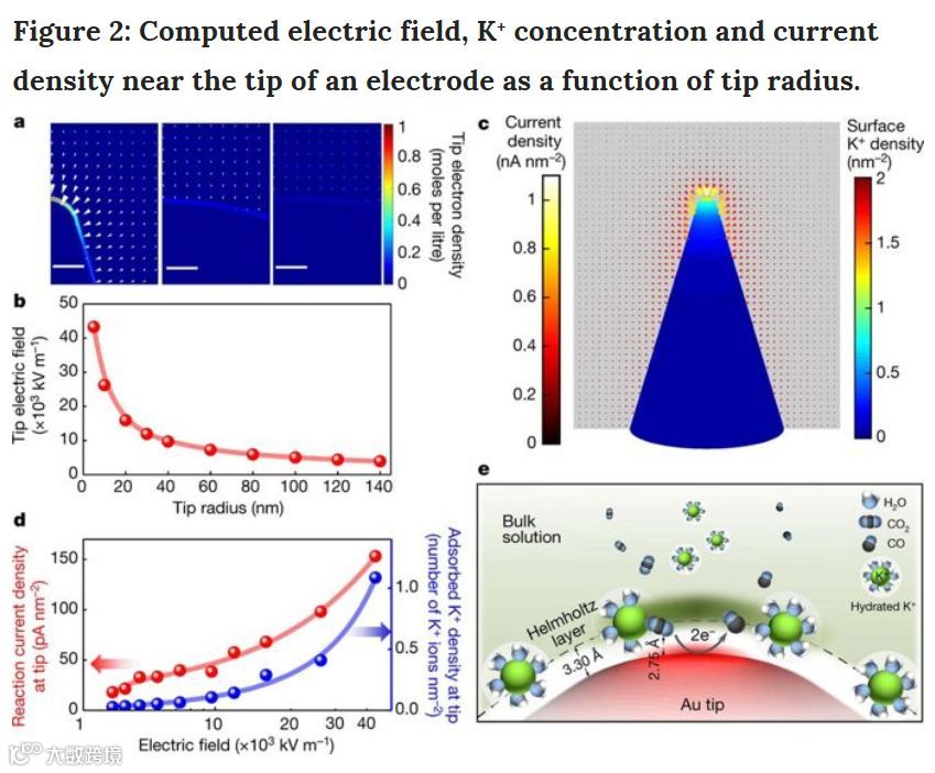 图2:通过COMSOL 模拟计算得到电场和钾离子在空间中的分布以及表面电流密度。CO2在阴极表面发生还原反应,钾离子带正电荷能受到阴极的库仑吸引力吸附在电极表面形成扩散双电层。在电极尖端钾离子浓度会更高,表面电流密度也更大。电极表面曲率越小这种富集效果越强。通过COMSOL 模拟计算得到电场和钾离子在空间中的分布以及表面电流密度。CO2在阴极表面发生还原反应,钾离子带正电荷能受到阴极的库仑吸引力吸附在电极表面形成扩散双电层。在电极尖端钾离子浓度会更高,表面电流密度也更大。电极表面曲率越小这种富集效果越强。