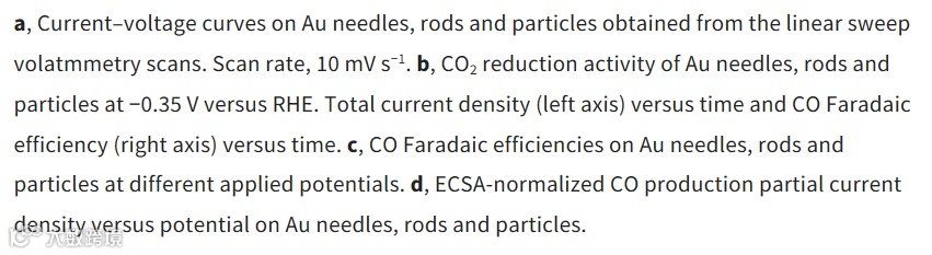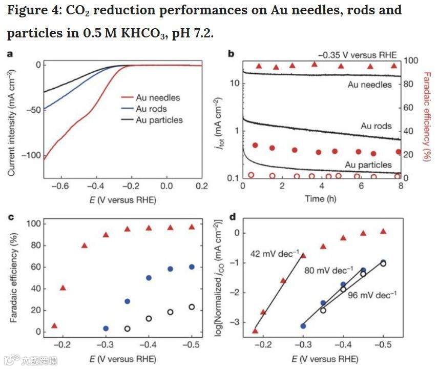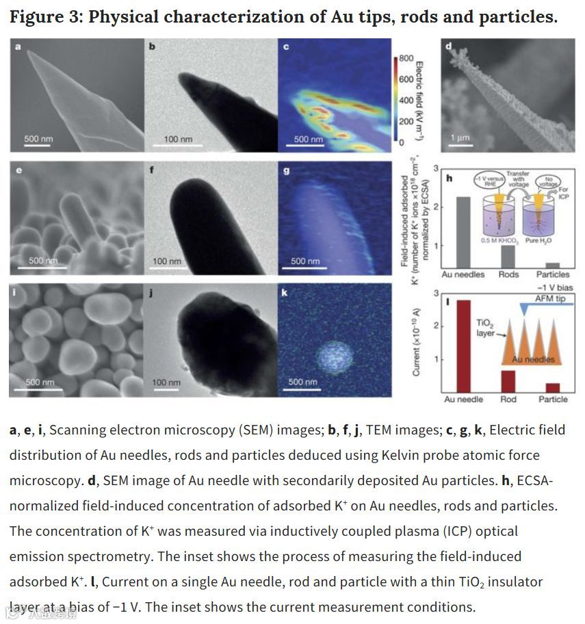 图4:尖锥纳米金、棒状纳米金和颗粒纳米金在0.5M KHCO3溶液中催化CO2 还原的效果对比。尖锥纳米金的催化效果要远好于棒状纳米金和颗粒纳米金,因为尖端曲率更显钾离子富集效果越强,降低了的CO2反应的能垒。