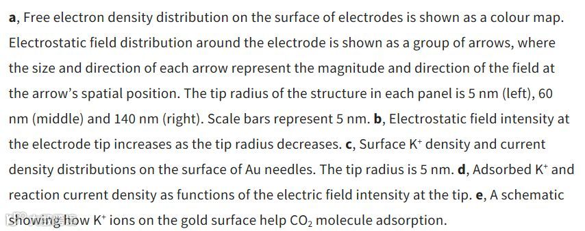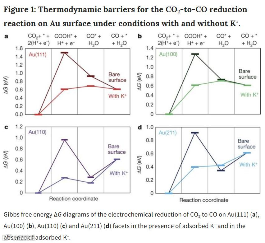 图1:钾离子在电极表面吸附能够降低CO2在金电极表面的反应势垒,提高化学反应速率。