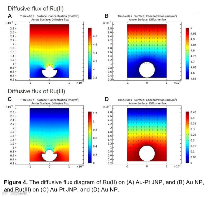 除了上面提到的Nature文章,另外这里提供另一篇COMSOL电化学模拟的典型文章,Electrogenerated Chemiluminescence Imaging of Electrocatalysis at a Single Au-Pt Janus Nanoparticle (Angewandte Chemie, 2018, 130(15): 4074-4078.)通过模拟得到了Au-Pt Janus 纳米颗粒在电化学过程中颗粒周围的物质浓度分布。