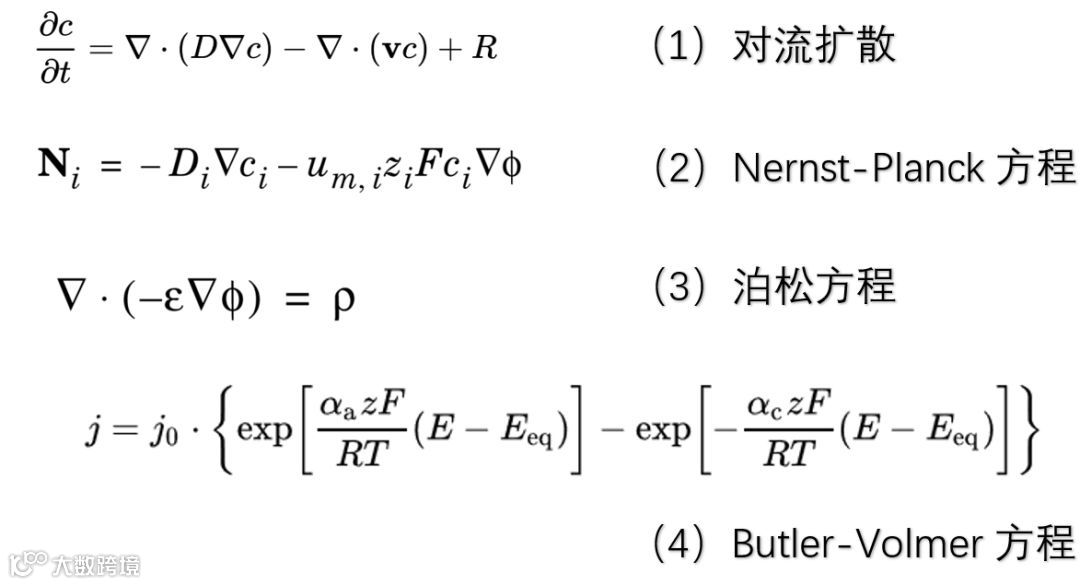 电化学反应的模拟会涉及到多个物理过程,包括物质扩散,带点离子在电场中的迁移和电极表面的化学反应。