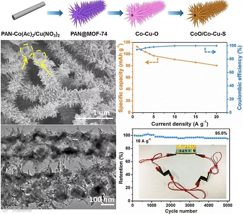浙江师范大学胡勇教授和新加坡南洋理工大学楼雄文教授团队通过有效的多步法制备由纳米针组成的CoO / Co-Cu-S分层管状异质结构(HTHS)。首先电纺聚丙烯腈 (PAN)-Co(Ac)2/Cu(NO3)2 复合NF用作自模板,然后通过金属离子和2,5-二羟基对苯二甲酸(H4DOBDC)之间的配位形成PAN@MOF-74 核壳NF。随后,移除PAN核以产生HTHS时,MOF-74通过空气中退火转变成Co/Cu混合氧化物(表示为Co-Cu-O)。进一步通过在N2气氛中与S粉末退火,对Co-Cu-O HTHS硫化,得到CoO / Co-Cu-S分层管状异质结构。
