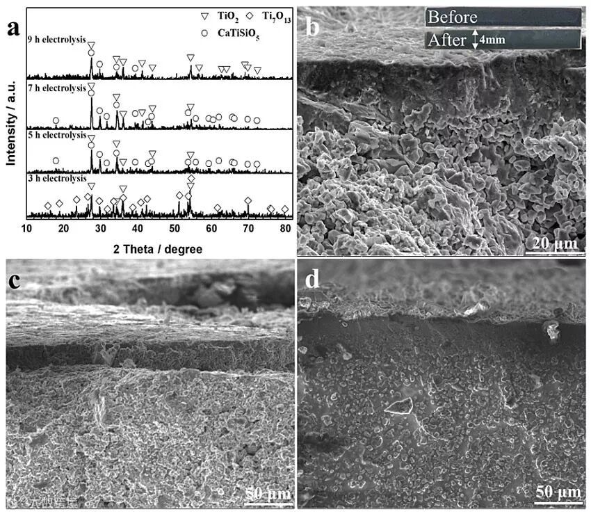 接着作者通过记录自电位(self-potential)表征了恒电流条件下在熔融CaCl2中Ti4O7电极的稳定性,并与石墨电极进行了对比(图3)。从结果可得以致密Ti4O7为电极时在反应之初(大概85 s)电压逐渐增加,而在此电压下不可能电还原硅,由XRD分析结果(图4b)可知应该是因为电极表面有TiO2生成。而电压达到稳定值(~2.1 V)之后可以保持16 h。而以多孔Ti4O7为电极时随着反应时间增加变化较大,这应该是因为熔融盐可以渗透进多孔电极的原因。