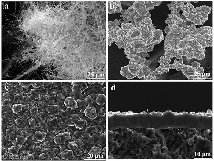 除此之外,通过调节阴极的电流密度可以获得不同形貌的单质硅。当电流为~10 mA/cm2 或者更低时单质硅为线状(图6a),如果电流密度为~20 mA/cm2时得到的是单质硅薄膜(图6b),而当电流密度为~15 mA/cm2时单质硅为颗粒状。更重要的是该电沉积过程消耗的能量与以石墨作为电极时相近。