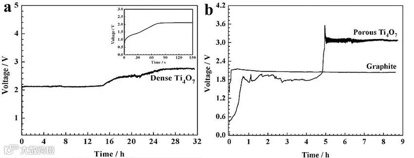 图3. 利用记录自电位表征恒电流条件下在熔融CaCl2中致密(a)和多孔(b)Ti4O7电极的稳定性。图片来源:Angew. Chem. Int. Ed.