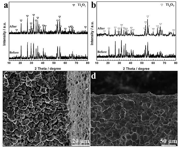 图2. 利用XRD和SEM进行表征Ti4O7电极在熔融熔融CaCl2浸泡前后的变化。图片来源:Angew. Chem. Int. Ed.
