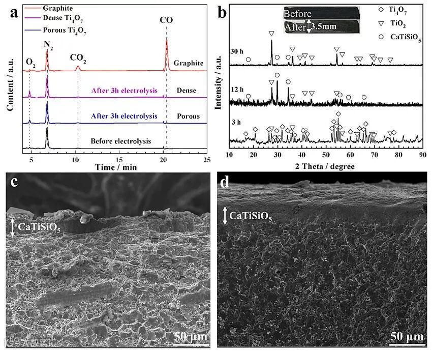 为了证明该方案的可行性,作者首先研究了该电极材料的稳定性。以Ti4O7为模型,将其浸泡在熔融CaCl2之后利用X射线衍射(XRD)和扫描电子显微镜(SEM)进行表征(图2),发现浸泡前后Ti4O7的晶格结构和表面基本没有变化,证明该电极材料具有良好的稳定性,并且不会与电解质发生反应。