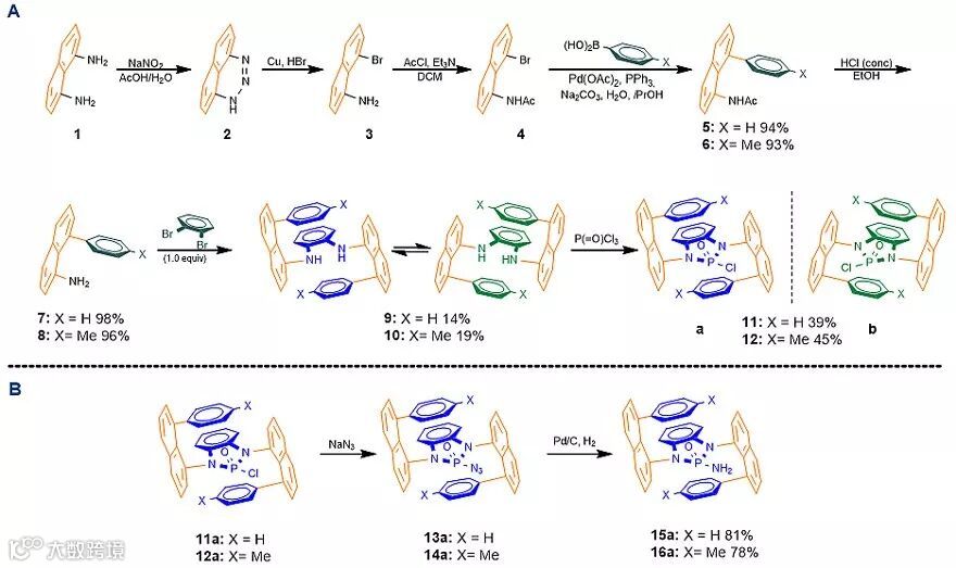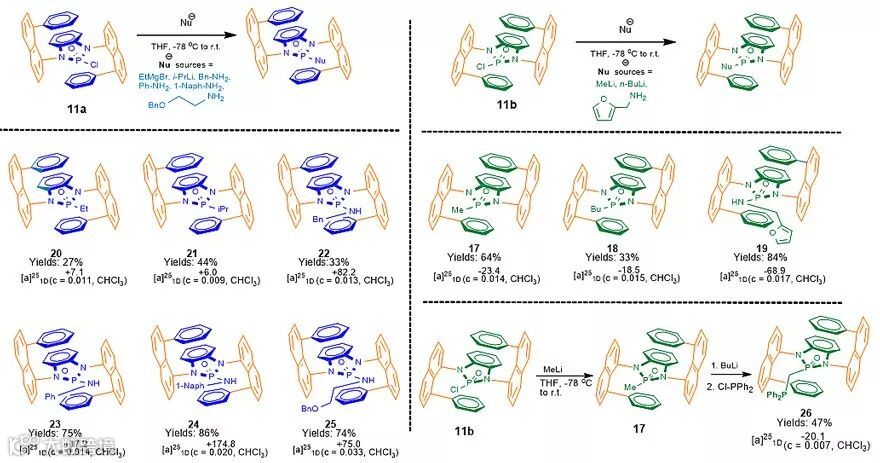 李桂根团队在寻找更有效的手性GAP试剂的过程中,考虑到在其1,2-双氨位置上引入两个8-苯基萘基团,可以更好地控制GAP试剂的反应性和不对称反应的选择性(图4)。不过经过长时间努力,化学合成并未能成功。他们发现主要问题在于双C-N键偶联的步骤,在传统的催化体系下偶联反应不能进行,或者反应产率极低。通过对Buchwald-Hartwig 偶联反应的条件和对底物的筛选,双C-N键偶联反应得以进行,从而使得GAP产物(新的磷酰氨)的多步全合成顺利完成。通过使用手性高压液相色谱方法,分离出它的两个镜像异构体,并且得到其中一个镜像异构体的单一晶体。对其进行X射线衍射分析,李桂根团队惊喜地发现了该分子具有多面3D手性。使用同样方法,分离出磷酰氨前体(磷酰氯)的镜像异构体,并且进一步将磷酰氯转化成一系列多面3D手性衍生物(图5)。