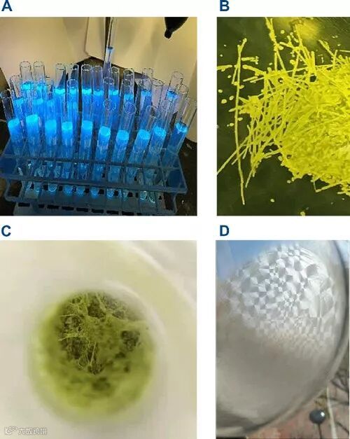 更有趣的是,多面3D手性化合物和前体表现出与普通有机小分子不一样的物理特征。可形成长短不一的棒状固体,长度可达几厘米(图6B);当它们在一个适当大小的圆底烧瓶中蒸发时,可形成鸟巢型网状结构(图6C)和多种规则的图案(图6D)。同时,文章中所有的多面3D手性化合物表现出多种色彩荧光(图6A)和AIE性质,其中一些分子显示出超强的旋光特征。这些结果为今后研究新型液晶、偏振光及其它光电材料提供了新的分子基础。