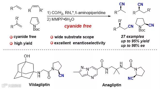 近日,南方科技大学张绪穆教授与武汉大学吕辉副教授合作,发展了一种无腈源合成手性腈类化合物的新方法。他们在烯烃不对氢甲酰化研究的基础上,发展了不对称氢甲酰化串联策略,通过不对称氢甲酰化/缩合/氮杂考普消除串联反应,实现了多种烯烃的形式不对称氢氰化反应,为无腈源合成手性腈类化合物提供了一条新的合成途径。相比烯烃传统的不对称氢氰化反应,该串联合成途径不需要使用剧毒的氰化氢,并且具有非常好的底物普适性,对各种芳基取代的单取代烯烃、1,2-二取代烯烃、1,1-二取代烯烃、环状烯烃均能取得高的产率和优异的对映选择性。该方法还能方便地实现克级规模的放大,产率和对映选择性不受影响。此外,该方法还可以高效地构建手性2-氰基吡咯烷,为药物维达列汀(Vildagliptin)和安奈格列汀(Anagliptin) 的高效合成提供了新途径。