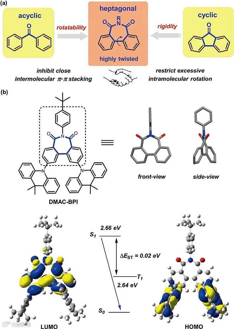 游劲松教授团队一直致力于碳氢键活化领域的研究,发展了“电子差异原则”和“螯合导向作用构筑稠杂环策略”,该策略为构筑联杂芳基骨架以及稠杂环提供了高效高选择性的合成方法,为有机功能材料分子的高效合成提供了重要途径。在该项研究中,作者通过钌催化的4-溴苯甲酸氧化自偶联反应,构筑了一种新型七元环二酰亚胺(BPI)受体,其不仅可以保持非环结构的柔性,抑制分子间紧密堆积,减弱ACQ效应;又可以维持环状结构的刚性,限制分子的过度旋转,减小非辐射跃迁。作者以BPI为受体,以9,10-二氢-9,9-二甲基吖啶(DMAC)作为给体,设计合成了一种新型AIDF材料,DMAC-BPI,其具有极小的∆EST (0.02 eV)和极高的量子产率(95.8%)。