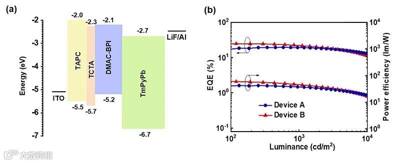 图2. DMAC-BPI的非掺杂OLED器件结构及效率随亮度变化曲线