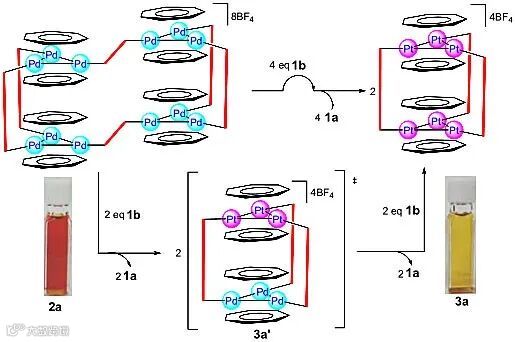 作者利用S-Pd的键能与S-Pt的键能之间的差异,进一步研究了金属团簇驱动结构转换过程,利用核磁、质谱、紫外可见吸收等检测手段也有力地证明了于[(Tr2Pd3)4(L1)6](BF4)8 (2a)的二氯甲烷溶液中加入2当量的1b,室温下就可以得到当量的[(Tr2Pt3)2(L1)3](BF4)4 (3a)。此外,3a’作为转换过程中的过渡态并在利用质谱追踪转换反应时被证实。