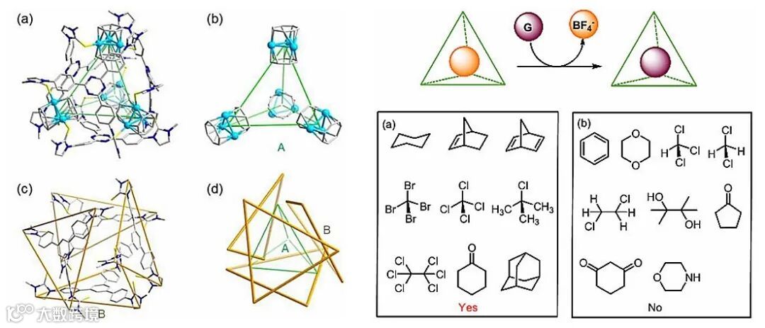 在此基础上,作者通过合理设计三齿卡宾加合物并利用其与夹心型金属-金属键的多中心基元构筑了如图3所示的(Tr2Pd3)4L4型的四面体有机金属笼。该类四面体超分子结构具有一定大小的空腔,作者初步研究了其作为主体分子在选择包裹不同分子或离子中的应用。该类有机金属框架在催化、分离、识别等方面具有良好的潜在应用前景。