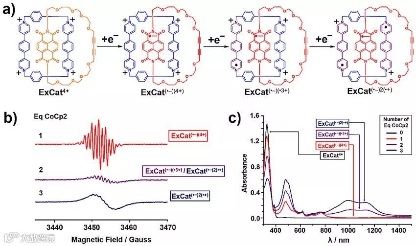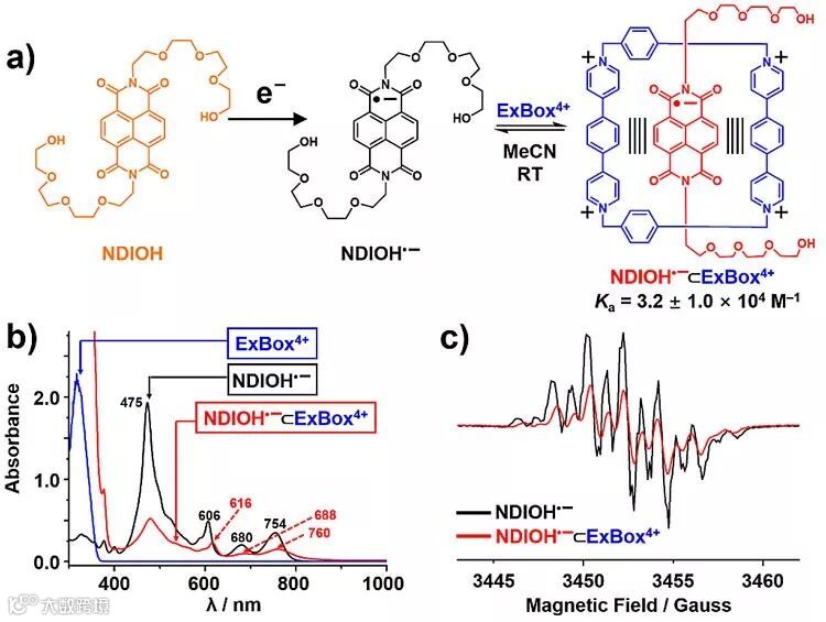 研究最初来源于以下想法:ExBox4+的内部空腔具有14 Å的宽度,足够容纳一个NDI自由基阴离子,这允许二者形成主客体复合物。甚至进一步合成索烃等机械互锁分子,探究不同组分间的自由基相互作用。