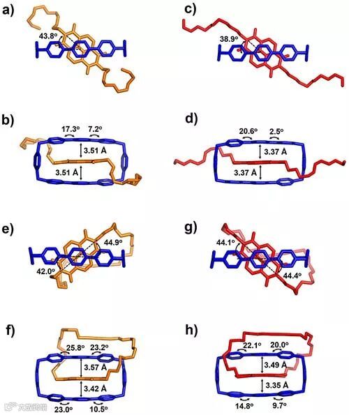 图2. (a, b)NDI⊂ExBox4+、(c, d)NDI•-⊂ExBox4+、(e, f)ExCat4+、(g, h)ExCat(•–)(4+)的单晶结构图。