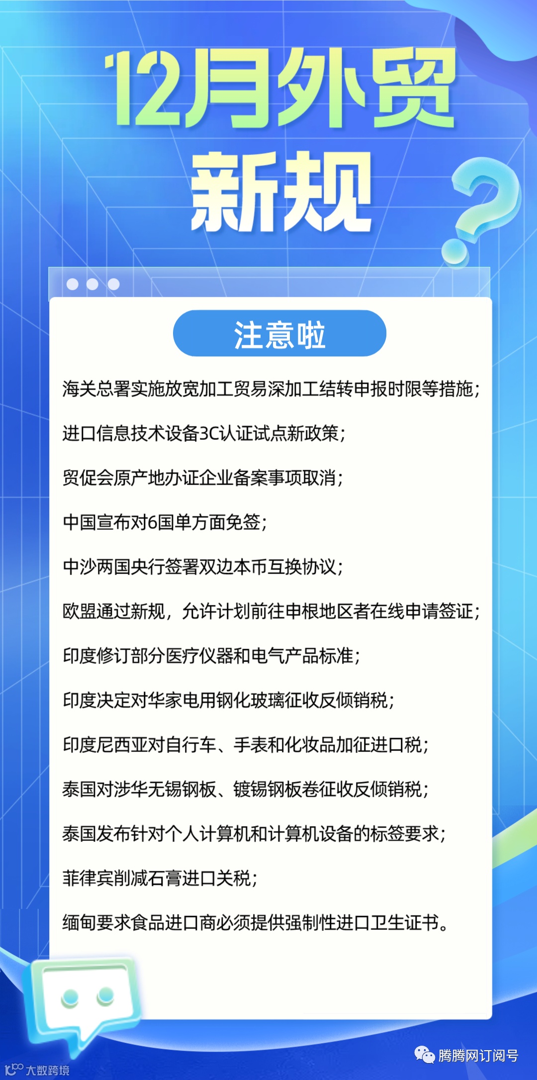 1.海关总署实施放宽加工贸易深加工结转申报时限等措施 海关总署发布《关于实施放宽加工贸易深加工结转申报时限等措施的公告》,其中提出,采用集中申报方式办理深加工结转业务的,企业应于每月底前对上月深加工结转核注清单及报关单进行集中申报。方案全文:http://www.customs.gov.cn/customs/302249/2480148/5494187/index.html 2.进口信息技术设备3C认证试点新政策 市场监管总局、海关总署近日发布公告,决定对试点地区(适用范围:上海、广东、天津、福建、北京自由贸易试验区和海南自由贸易港)进口信息技术设备强制性产品认证(CCC认证)要求予以调整。对于在试点地区进口的CCC认证范围内信息技术设备,认证委托人在申请CCC认证时,可以采用自我声明评价方式证明产品符合CCC认证电磁兼容性标准。公告原文:https://www.cnca.gov.cn/zwxx/gg/lhfb/art/2023/art_8e57674ae0e64258a3ef8f9679cfa1ee.html3.贸促会原产地办证企业备案事项取消 为贯彻落实国家外经贸政策,进一步优化营商环境,促进外贸工作高质量发展,自2023年11月1日起,中国贸促会及其地方签证机构取消原产地企业注册备案事项,新企业申请办理贸促会原产地证书应提交《声明》(中国贸促会原产地声明提交流程.docx),具体安排如下:一、对于已经完成对外贸易经营者备案的企业,延用“两证合一”注册方式不变。企业可直接使用统一社会信用代码登录中国贸促会原产地证网上签证系统,申办原产地证书,不必提交《声明》。二、对于未完成对外贸易经营者备案,且未在贸促会进行过原产地企业注册备案的企业,申办原产地证书前应向中国贸促会原产地签证机构提交完整准确填写的《声明》(声明.docx)及相关佐证材料,即可申办贸促会原产地证书。4.中国宣布对6国单方面免签 11月24日,外交部发言人毛宁宣布,中方决定试行扩大单方面免签国家范围,对法国、德国、意大利、荷兰、西班牙、马来西亚6国持普通护照人员试行单方面免签政策。2023年12月1日至2024年11月30日期间,上述国家持普通护照人员来华经商、旅游观光、探亲访友和过境不超过15天,可免办签证入境。 5.中沙两国央行签署双边本币互换协议 经国务院批准,近日中国人民银行与沙特中央银行签署了双边本币互换协议,互换规模为500亿元人民币/260亿沙特里亚尔,协议有效期三年,经双方同意可以展期。央行称,中沙建立双边本币互换安排,将有助于加强两国金融合作,扩大中沙间本币使用,促进双方贸易和投资便利化。 6.欧盟通过新规,允许计划前往申根地区者在线申请签证 当地时间11月13日,欧盟理事会批准了申根签证数字化相关的新法规,创建统一的申根签证线上申请平台,从而使未来申根签证的申请程序更加便捷。欧盟理事会在当天发布的一份声明中说,根据新规,欧盟将创建统一的申根签证线上申请平台。除少数例外情况,申根签证申请者将不用再前往申根国家使领馆,而是通过该数字平台进行申请。欧盟委员会此前表示,该平台预计于2024年开始开发,并于2026年投入使用。签证申请人将在该平台上输入所有相关信息,上传旅行证件和证明文件的电子版,并支付签证费用。与此同时,当前的签证贴纸也将由加密签名的条形码取代。据悉,新规将在欧盟官方公报上发布的第20天起生效,具体实施日期将在线上签证平台和数字签证的技术工作完成后确定。7.印度修订部分医疗仪器和电气产品标准印度标准局(BIS)发布公报,宣布修订了部分医疗器械和电气产品标准。修订后的标准于2023年10月2日正式实施,此前执行标准将逐步废止。 8.印度决定对华家电用钢化玻璃征收反倾销税 2023年11月17日,印度财政部税收局发布第17/2023-Customs(ADD)号通报称,接受印度商工部于2023年8月28日对原产于或进口自中国的厚度在1.8毫米至8毫米之间、面积小于等于0.4平方米的家电用钢化玻璃(Toughened Glass for home appliances having thickness between 1.8 MM to 8 MM and area of 0.4 SqM or less)作出的反倾销肯定性终裁建议,决定对中国的涉案产品征收为期5年的反倾销税,税额为0~243美元/吨(征税详情见本案终裁公告)。涉案产品的印度海关编码为70071900、70072900、70134900、70139900、70199000、70200019、70200029和70200090。以下产品不适用于本案的反倾销措施:用于器皿玻璃盖的钢化玻璃、用于电子开关和开关板面板的钢化玻璃、用于洗衣机的弧形彩色玻璃、用于双层玻璃窗(DGU)的钢化玻璃、圆顶形钢化玻璃、槽纹钢化玻璃。 9.印度尼西亚对自行车、手表和化妆品加征进口税印度尼西亚通过财政部关于寄售货物进出口海关、消费税和税收规定的第96/2023号条例,对四类货物征收额外进口税。化妆品、自行车、手表和钢铁产品已从2023年10月17日起加征进口关税。化妆品的新关税是10%至15%;自行车的新关税是25%至40%;手表的新关税是10%;钢铁产品的新关税最高可达20%。新规定还要求电子商务公司和在线供应商与海关总署共享进口商品信息,包括公司和卖家的名称,以及进口商品的类别、规格和数量。新关税是贸易部上半年关税规定的补充,当时对三类商品征收了高达30%的进口税:鞋类、纺织品和手提包。10.泰国对涉华无锡钢板、镀锡钢板卷征收反倾销税2023年10月25日,泰国倾销和补贴审查委员会发布公告称,决定重新实施对原产于中国、韩国和欧盟的无锡钢板(泰语:สินค้าเหล็กแผ่นชุบหรือเคลือบด้วย