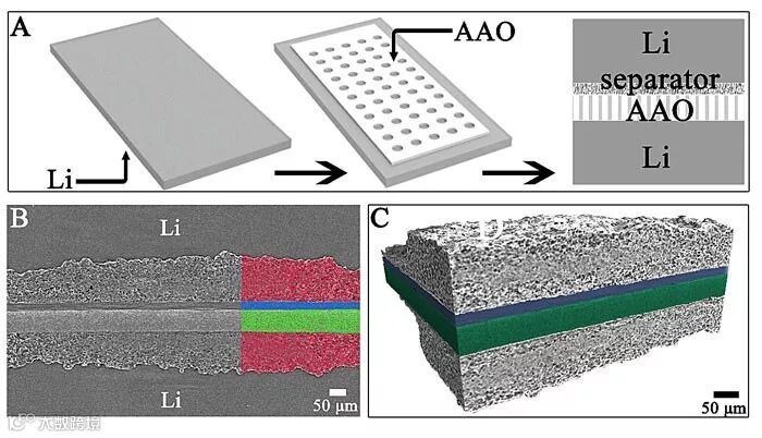 图3.(A)使用AAO膜保护的锂电极组装对电池示意图。同步辐射X射线成像表征对电池循环后的电极截面图(B)及三维显示图(C)