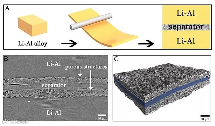 图1.(A)使用锂铝合金组装对电池示意图。同步辐射X射线成像表征对电池循环后的电极截面图(B)及三维显示图(C)