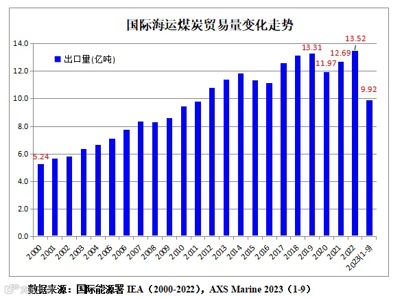 数据显示,今年前三季度全球海运煤炭总装载量9.917亿吨,不仅高于2022年同期的9.396亿吨,也高于2021年同期的9.471亿吨,并远高于2020年同期的8.818亿吨,而且还首次出现高于疫情前2019年同期的水平(9.749亿吨)。