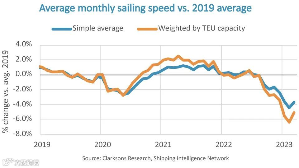 在疫情流行期间,由于需求强劲和港口普遍拥堵,班轮运营商将平均航行速度提高了4%。如今,疫情结束,市场趋于稳定,2023年第一季度的平均航速已降至13.8节,同比下降4%,到2025年可能下降10%。