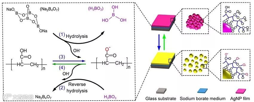 以硼酸钠等强碱弱酸盐作为媒介层,制备的银纳米粒子薄膜宏观上呈粉红色,遇水汽(呵气或指尖挥发的汗液)即发生粉红色与亮黄色之间的可逆颜色变化,可逆切换时间小于1 秒,且循环次数高达1000次以上。其可逆变色机理为:当水汽作用时如硼酸钠率先水解,产生氢氧根离子(OH-),OH- 促进银纳米粒子表面羧基电离,增加了相邻银纳米粒子间的静电排斥力,使颗粒间距变大,偶合作用减弱,薄膜由粉红色迅速变为亮黄色。反之,停止施加水汽,硼酸钠反向水解,银纳米粒子之间静电排斥力减弱,颗粒间距变小, 颜色由亮黄色恢复为粉红色。结合光刻技术,可以在薄膜表面任意打印隐形文字和图案,分辨率高达5微米。通过水汽作用,可以实现文字和图案的显现和掩藏,在防伪和信息隐藏等领域展现出了巨大的应用价值。