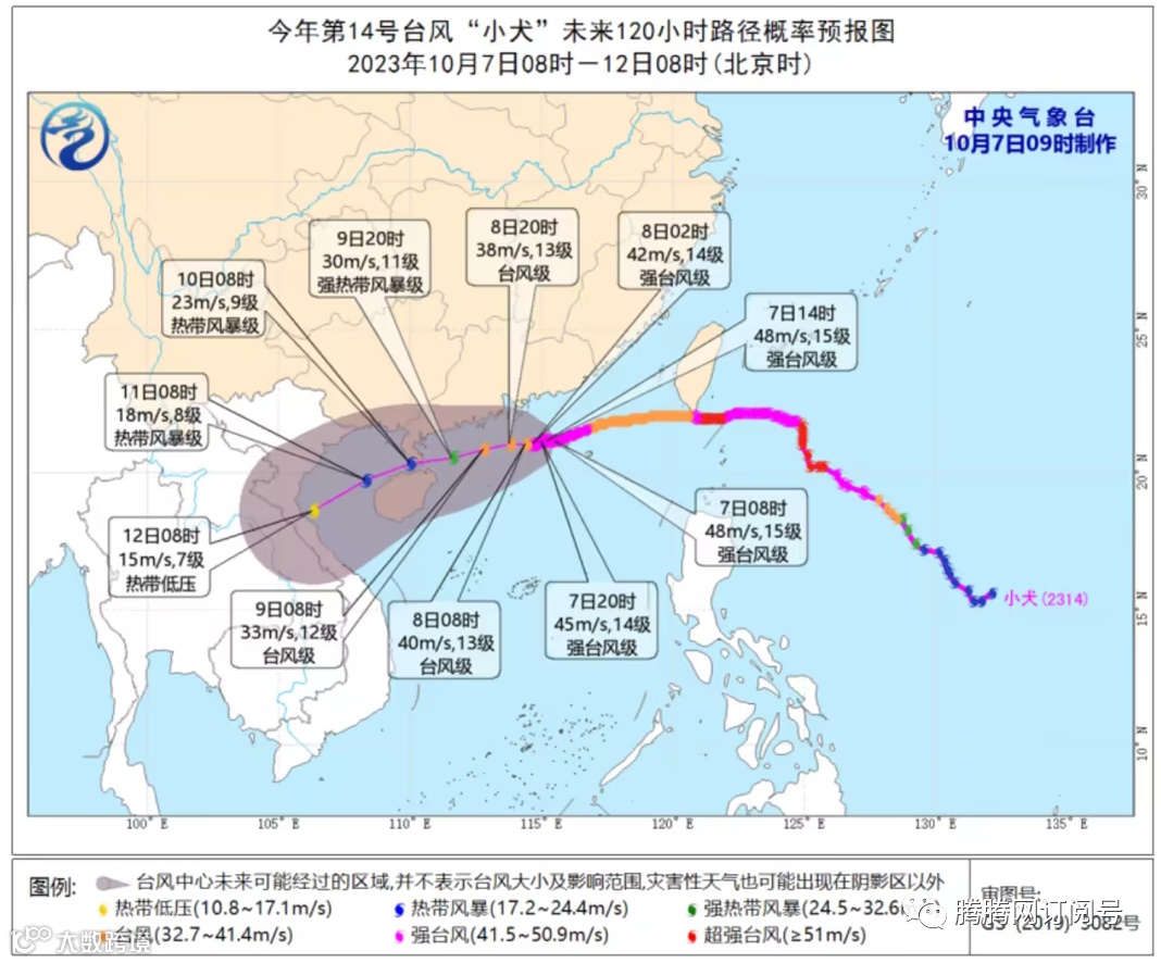 预计,“小犬”将以小时5到10公里的速度向西偏南方向缓慢移动,强度变化不大,或对广东省中东部沿海及海面造成严重影响。