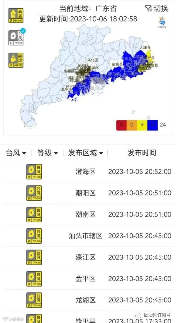截至10月6日18时02分,广东省共有9个台风黄色预警,39个台风蓝色预警,24个台风白色预警信号正在生效。