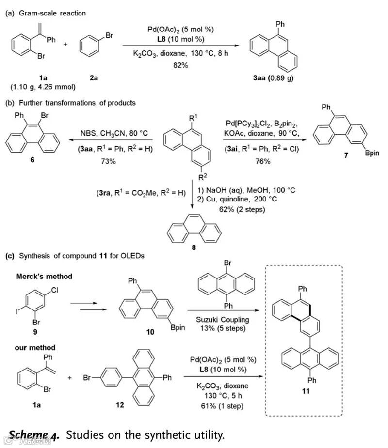 该反应所产生的稠环类化合物,是一类在药物,材料分子中都比较常见的骨架。反应产物可进行多样化转化,并可实现克级放大反应,进一步增强了该反应的潜在应用性。利用这一方法学,Merck公司报道的具有 OLED效应的化合物11,仅需一步即可以61%的产率获得(原方法需5步,产率为13%)(见图4),也为这一反应的应用性提供了一个很好的例证。