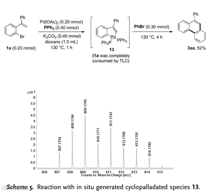 研究团队对于反应机制也进行了探索。利用高分辨SAESI-MS,并结合二级碎片及同位素分布分析,确证了芳基/烯基环钯物种的存在,为设想的反应机制提供了强有力的实验证据。