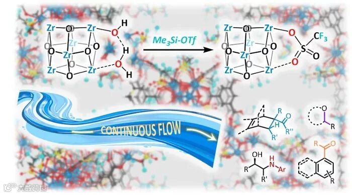 图1. 超强Lewis酸性MOF材料用于连续流动相催化反应示意图