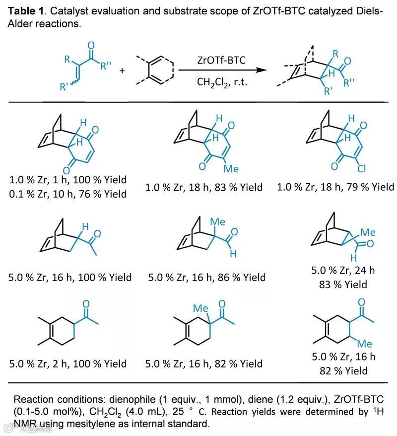 图3. ZrOTf-BTC用于催化Diels-Alder环化反应的催化活性和底物适应性研究