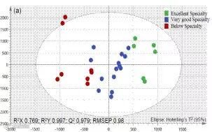 Devin Peterson团队首先运用非目标化学表征组学结合液相色谱质谱联用仪(LC/MS)分析咖啡样品中的化学小分子。他们选用来自亚、非、美三大洲产地的18种绿咖啡豆样品,根据国际精品咖啡协会(SCA)的Q分级认证方式和cup得分法,将样品分为3个质量等级:次品(<80)、优品(80-85)、特优品(85-90)。他们用LC/MS从这些样品煮熟的咖啡中共表征标记了2450个化学小分子。随后,他们运用多变量统计分析(MVA)建立煮咖啡化学因子与cup得分相互关系模型。多变量模型包括:主成分分析(PCA)和正交偏最小二乘法(OPLS)(图 1)。通过这一系列统计分析,从2450个小分子中筛选出最影响样品质量等级变化(从次品到优品直至特优品)的4个小分子:4.13_193, 7.00_437, 8.25_671, 8.52_419(化合物用LC/MS的保留时间和分子量表示,比如4.13_193表示色谱保留时间4.13 min,分子量为193的化合物)。