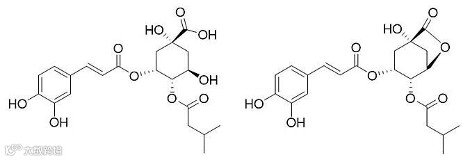 至此,3个影响咖啡品质的化合物已经从咖啡样品纷繁复杂的多因素体系中脱颖而出。那么,“大案牍术”筛出来的到底是什么化合物?下一步,就是运用核磁共振波谱(NMR)和高分辨质谱(HRMS)鉴定出这3个化合物结构了。高分辨质谱推测分析化合物元素组成,MS/MS分析裂解片段,结合一维/二维核磁图谱解析化合物的官能团和连接方式。最后鉴定出两个化合物的结构,它们分别是3-O-caffeoyl-4-O-3-methylbutanoylquinic acid(下图左)以及3-O-caffeoyl -4-O-3–methyl butanoyl-1,5-quinide(下图右),均为新结构化合物。遗憾的是,Devin Peterson团队并没有完全解析出化合物8.25_671的结构,只是推出了部分结构片段,这给本研究留下了一个悬念。两个新化合物,是含有3-甲基丁酸酯片段(3-methylbutanoic ester moiety)的绿原酸衍生物。以往文献报道,绿原酸在食品或饮料体系中增加某些挥发性物质的水溶性,会影响食物或饮品的口感味道。