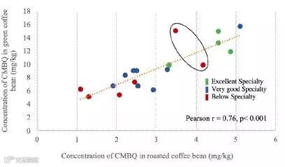 化合物3-O-caffeoyl-4-O-3-methylbutanoylquinic acid 在绿咖啡豆和烘焙咖啡豆中的相关浓度。图片来源:Food Chem.
