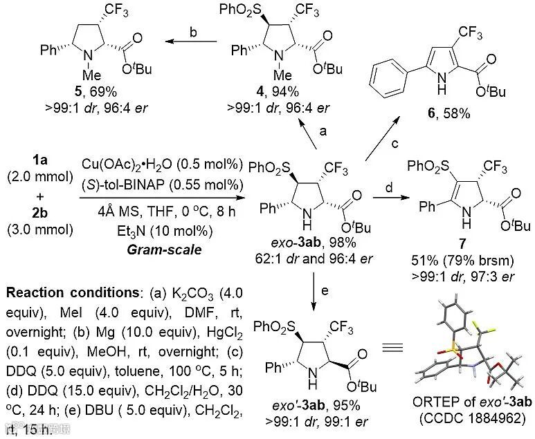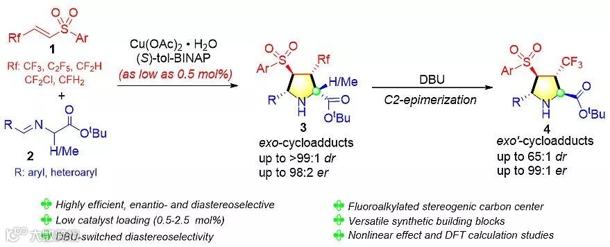 武汉理工大学黄毅勇教授课题组致力于手性含氟杂环化合物的催化不对称合成方法学研究,针对含三氟甲基多取代四氢吡咯化合物的重要性和合成难题,以及芳香砜基在后续衍生化过程中的重要性,巧妙设计合成了一类新型含三氟甲基不饱和砜类化合物,并将其应用于甲亚胺叶立德的1,3-偶极环加成反应中。采用商业易得(S)-tol-BINAP/Cu(OAc)2配合物作为催化剂(最低负载量为0.5 mol%),含不同取代基的亚胺酸酯及含氟烷基不饱和砜都可以在此类反应中得到应用。最终,以最高97%产率,大于99:1的非对映选择性比例(exo :endo)和98:2的对映选择性比例得到多种含氟烷基手性四氢吡咯化合物。该课题组还进一步与该校材料科学与工程国际化示范学院赵焱教授合作,通过密度泛函理论(DFT)和非共价键相互作用(NCI)计算方法,对此反应的反应历程和优势立体选择性诱导机制进行了解释,并提出了可能的反应机理。该反应可以扩大至克级反应规模,催化剂的用量可以降低至0.5 mol%,这充分说明该方法具有十分重要的实际合成应用价值。此外,催化产物通过不同反应条件可以得到含三氟甲基二氢吡咯和吡咯类杂环化合物。尤其重要的是,exo型催化产物经DBU简单处理后可得到其差向异构体(exo'),实现了非对映发散式合成(最高95%产率,65:1dr和99:1er)。